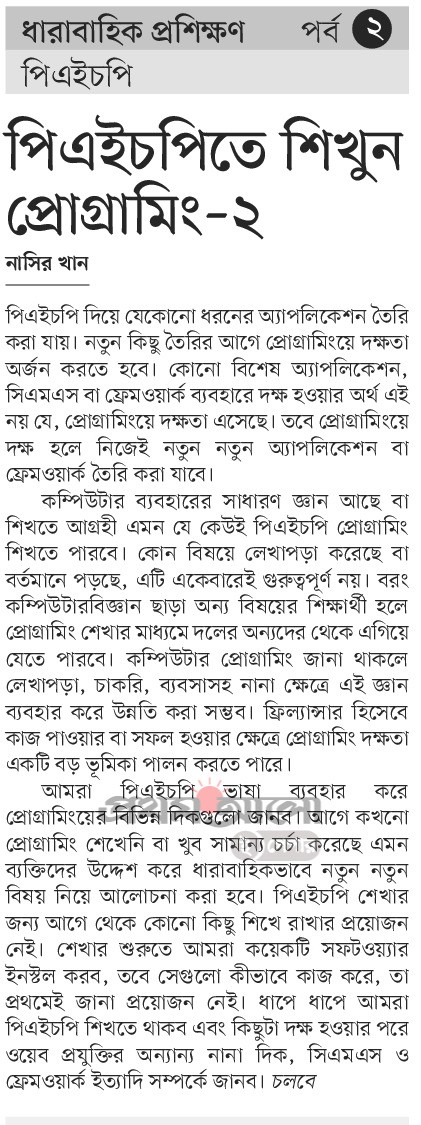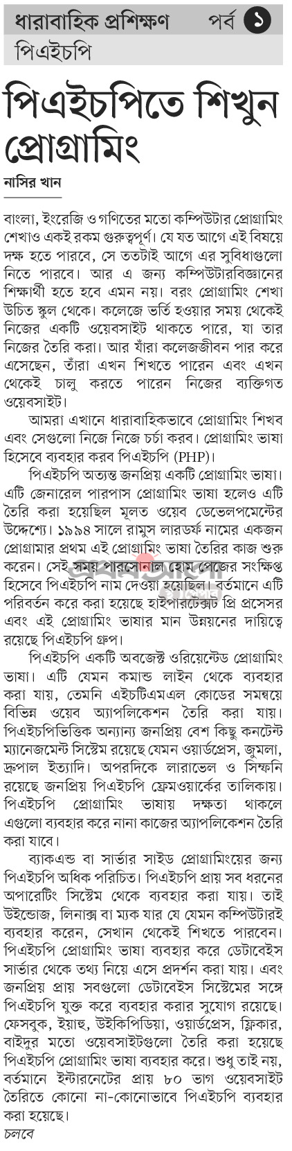 আমরা এখানে ধারাবাহিক ভাবে প্রোগ্রামিং শিখবো এবং সেগুলো নিজে নিজে চর্চা করবো। প্রোগ্রামিং ভাষা হিসাবে ব্যবহার করবো পিএইচপি (PHP)।